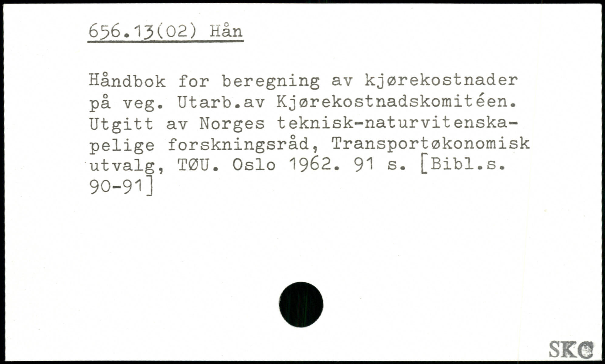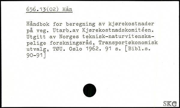 Håndbok for beregning av kjørekostnader på veg. Utarb.av Kjørekostnadskomiteen. Utgitt av Norges teknisk-naturvitenska-pelige forskningsråd, Transportøkonomisk utvalg, TØU. Oslo 1962.