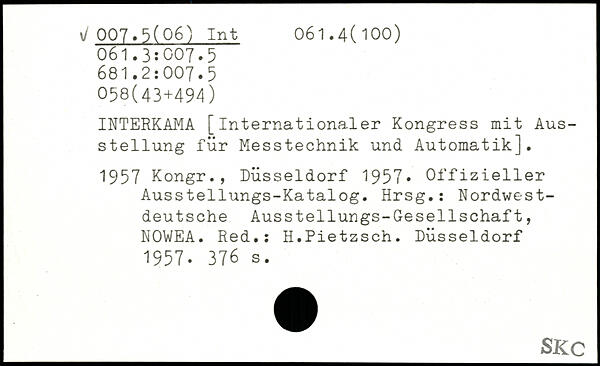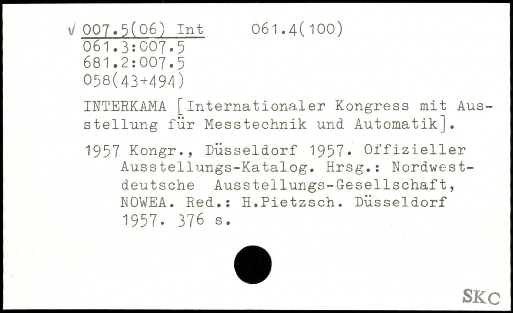 INTERKAMA [internationaler Kongress mit Ausstellung für Messtechnik und Automatik]. 1957 Kongr., Düsseldorf 1957, Offizieller Ausstellungs-Katalog. Hrsg.: Nordwestdeutsche Ausstellungs-Geseilschaft, NOWEA. Red.: H.Pietzsch. Düsseldorf 1957.