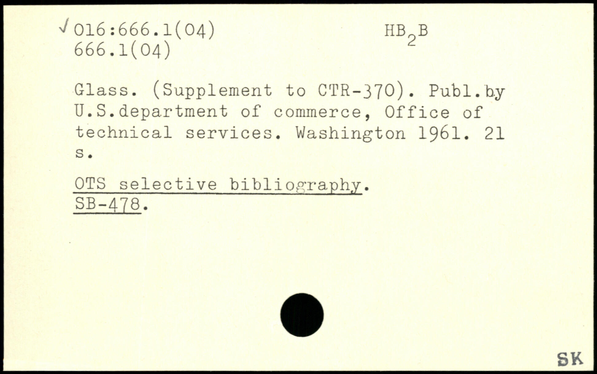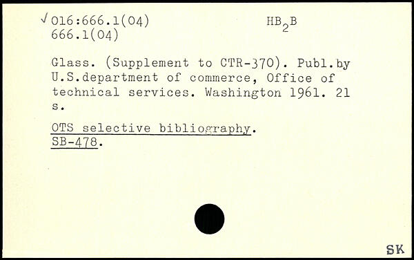 Glass. (Supplement to CTR-370). Publ.hy U.S.department of commerce, Office of technical services. Washington OTS selective bibliography. SB-478.