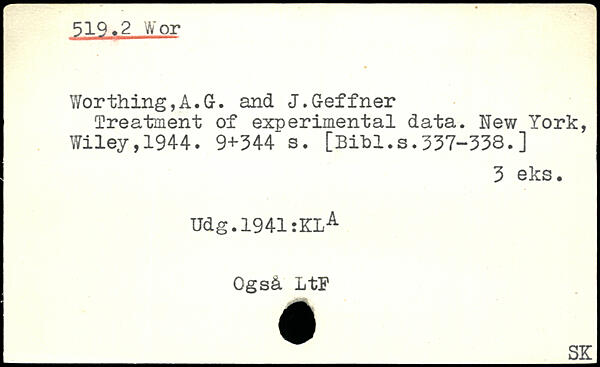 pj. . ■. "1 519,2 Wor Worthing,Å.Gr. and J.Geffner Treatment of experimental data.