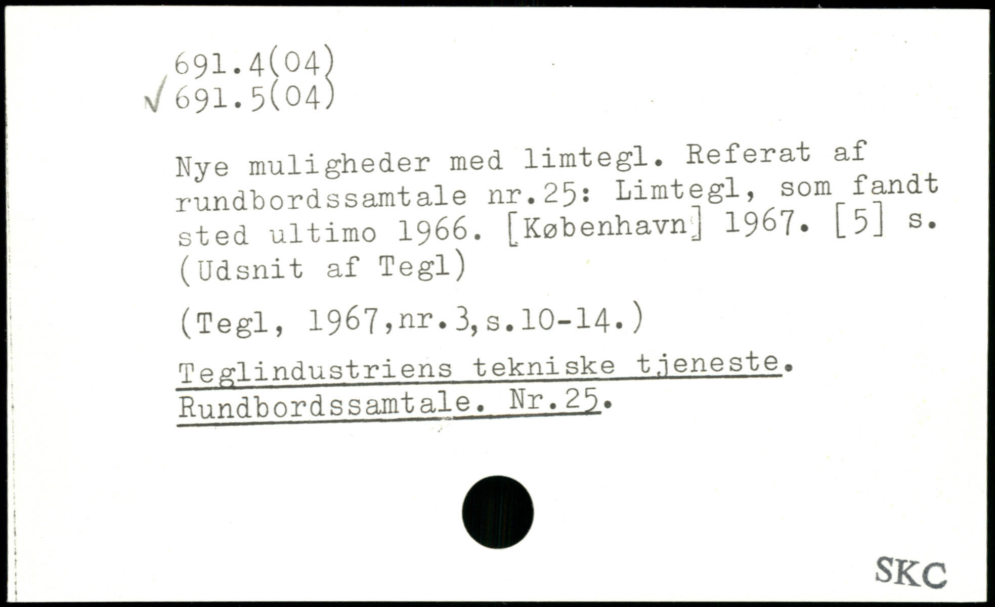 Nye muligheder med limtegl. Referat af rundbordssamtale nr.25: Limtegl, som fandt sted ultimo 1966. [Københavnj 1967. L 5J s. (Udsnit af Tegl)
