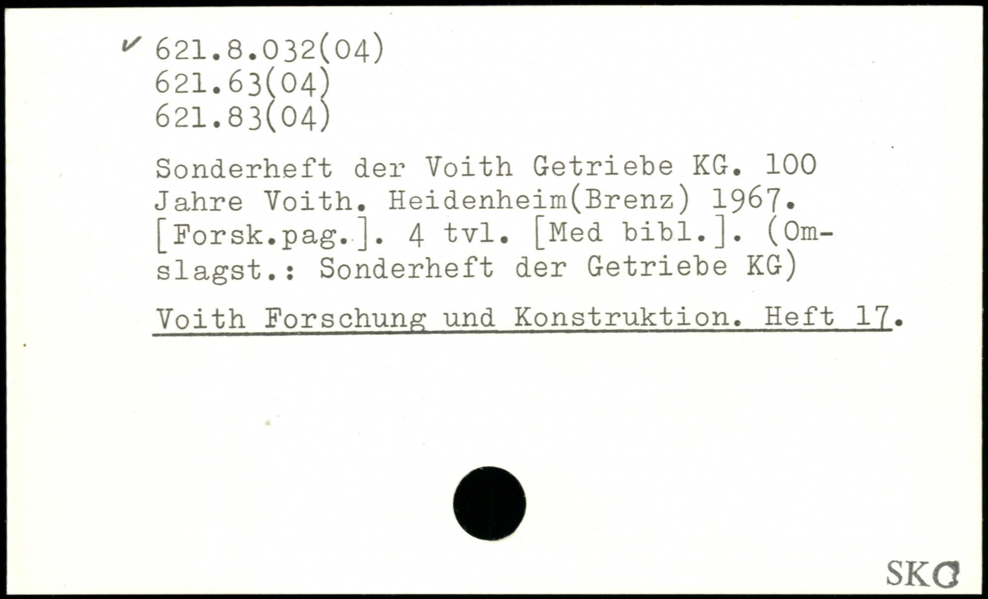 Sonderheft der Voith Getriebe KG. 100 Jahre Yoith. Heidenheim(Brenz) 1967, [Forsk.pag.]. 4 tvl. [Med bibl.]. (0m-slagst.: Sonderheft der Getriebe KG) Voith Forschung und Konstruktion, Heft 17_. _S KO