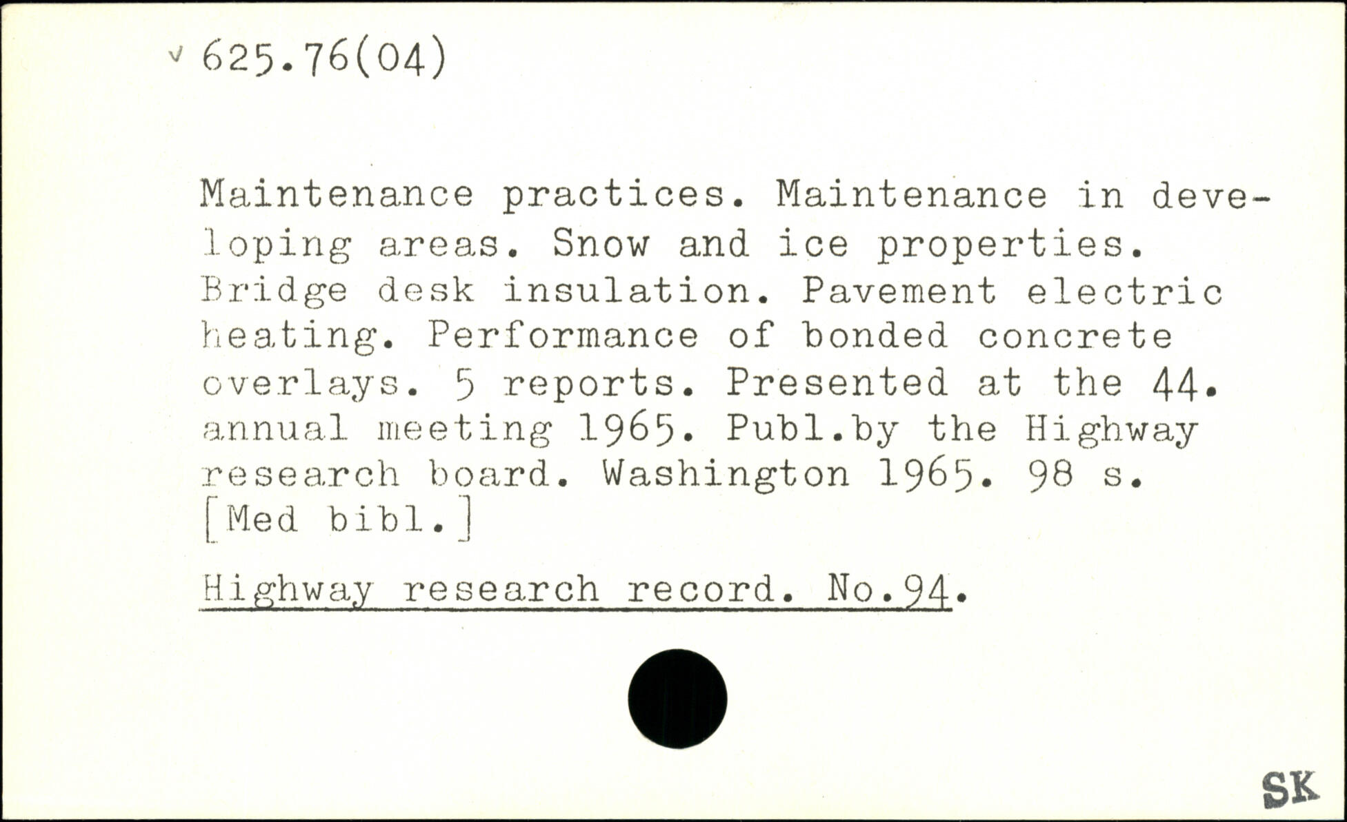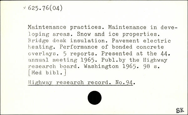 Maintenance practices. Maintenance in developing areas. Snow and ice properties. Bridge desk insulation. Pavement electric heating. Performance of bonded concrete overlays. 5 reports. Presented at the 44. annual meeting 1965.