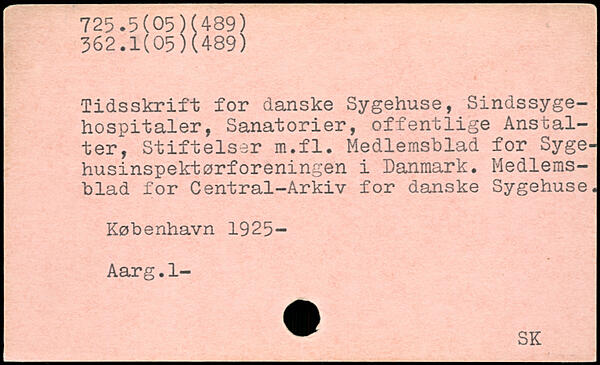 Tidsskrift for danske Sygehuse, Sindssygehospitaler, Sanatorier, offentlige Anstalter, Stiftelser m.fl. Medlemsblad for Syge-husinspektørforeningen i Danmark. Medlemsblad for Central-Arkiv for danske Sygehuse.
