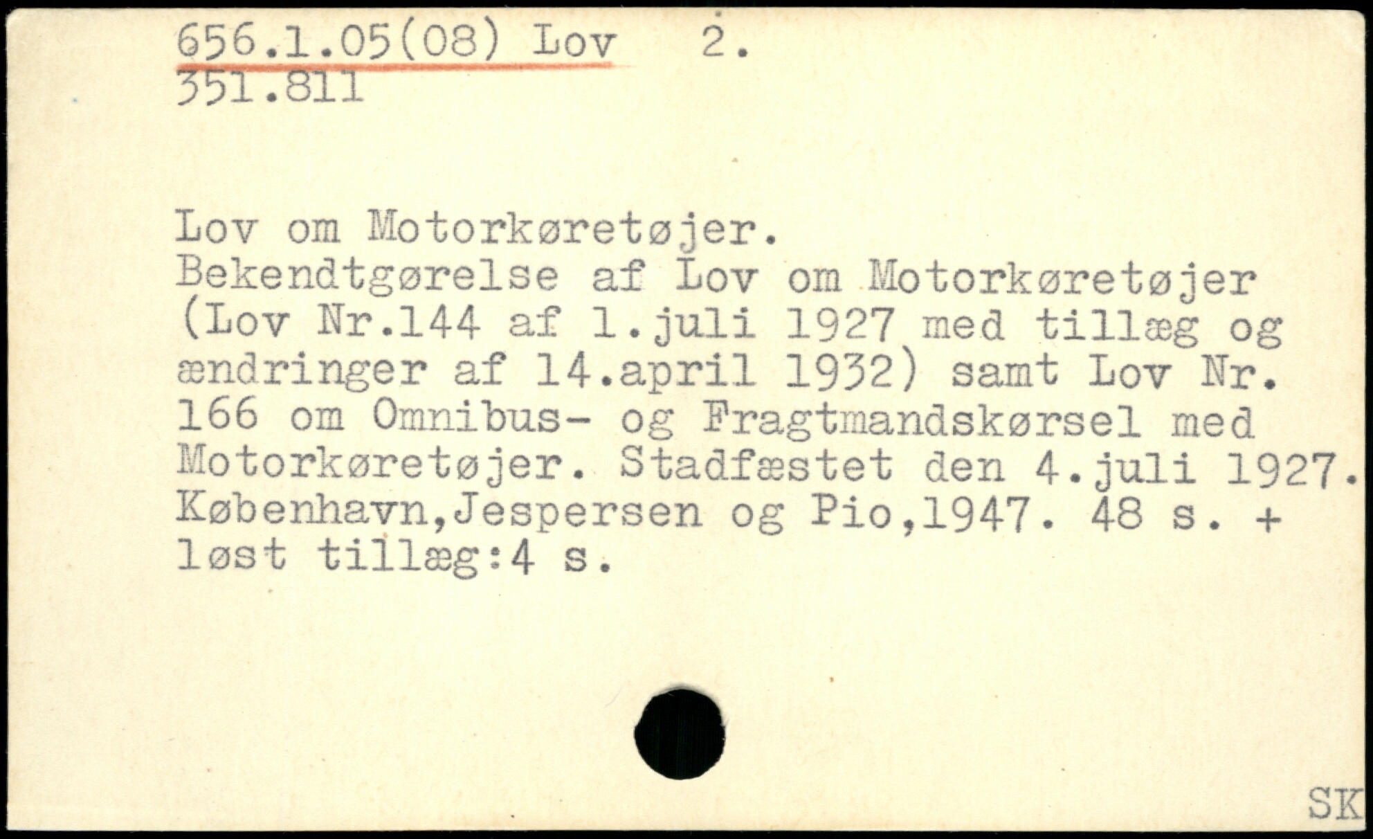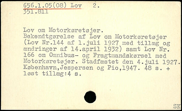 Lov om Motorkøretøjer. Bekendtgørelse af Lov om Motorkøretøjer (Lov Nr.144 af 1.juli 1927 med tillæg og ændringer af 14.april 1932) samt Lov Nr. 166 om Omnibus- og Fragtmandskørsel med Motorkøretøjer. Stadfæstet den 4.juli 1927.