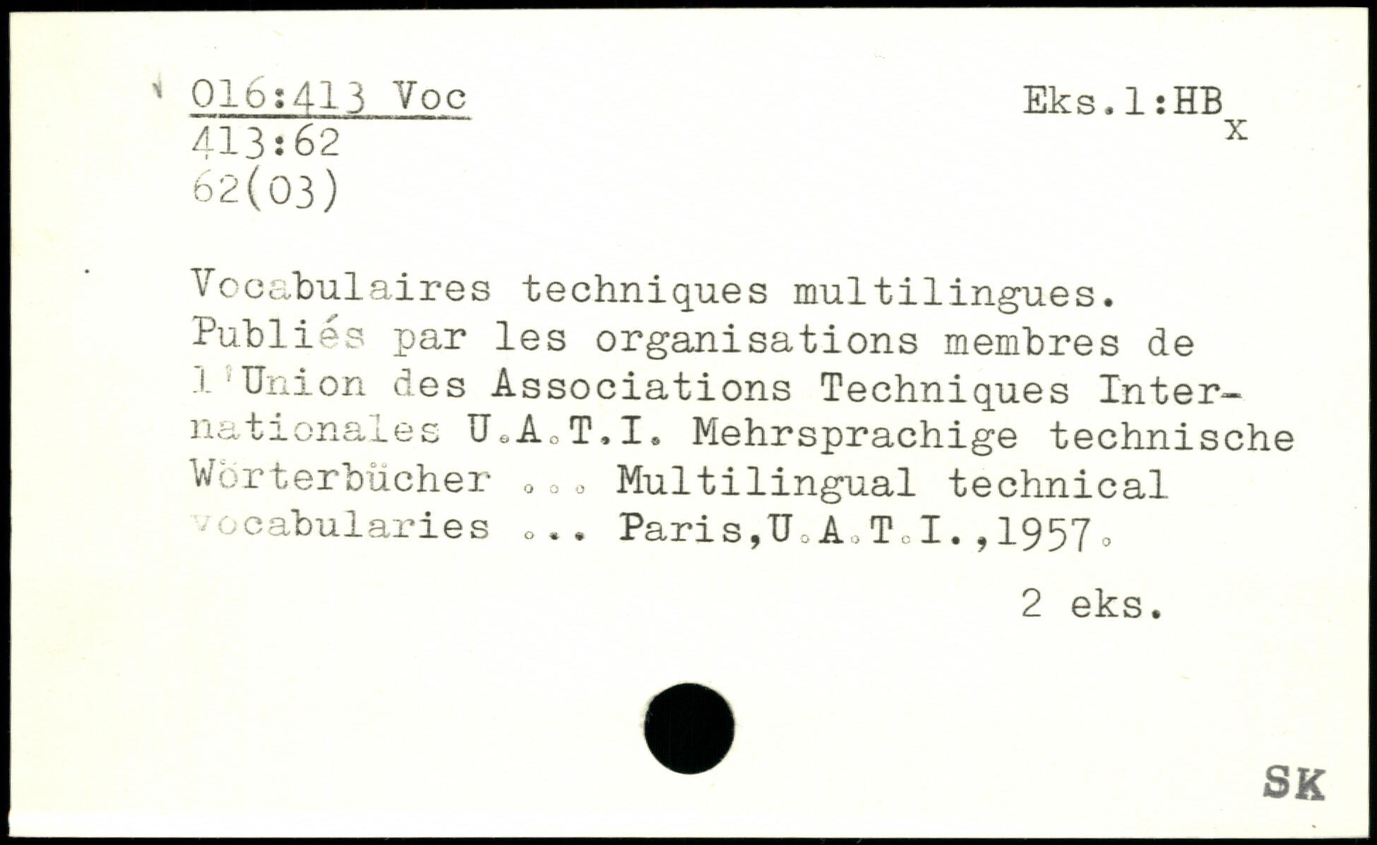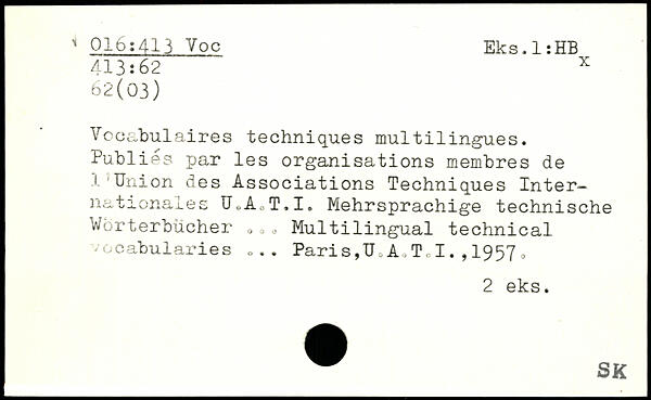 Vocabulaires techniques multilingues. Publiés par les organisations membres de 1'Union des Associations Techniques Internationales UeAcT.I. Mehrsprachige technische Wörterbücher 0□, Multilingual technical vocabularies Paris ,TJ, A. To I. , 1957 0