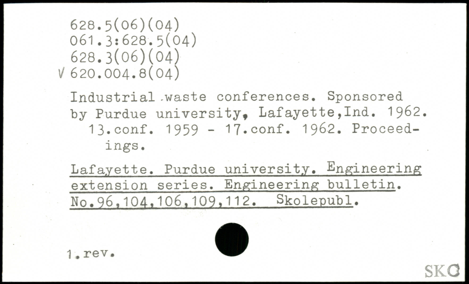 Industrial -waste conferences. Sponsored by Purdue university. Lafayette,Ind. 1962. 13.conf. 1959 - 17,conf. 1962. Proceedings. Lafayette. Purdue university. Engineering extension series. Engineering bulletin. No.96.104.106,109.112. Skolepubl.