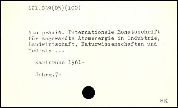 Atompraxiso Internationale Monatsschrift für angewandte Atomenergie in Industrie, Landwirtschaft, Naturwissenschaften und Medizin ,,, Karlsruhe 1961- Jahrg0 7-