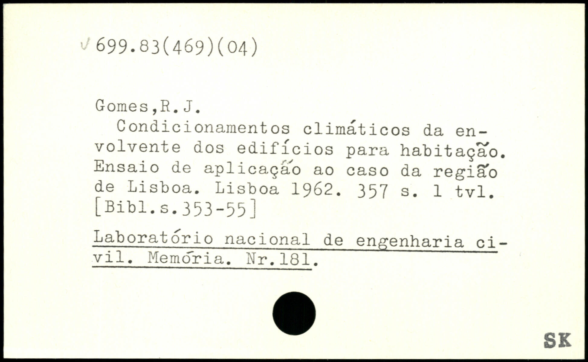 Condicionamentos climaticos da en-volvente dos edificios para habitaçao. Ensaio de aplicaçao ao caso da regiå'o de Lisboa. Lisboa 1962.