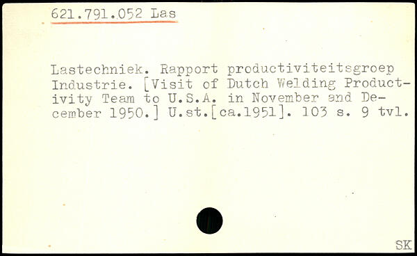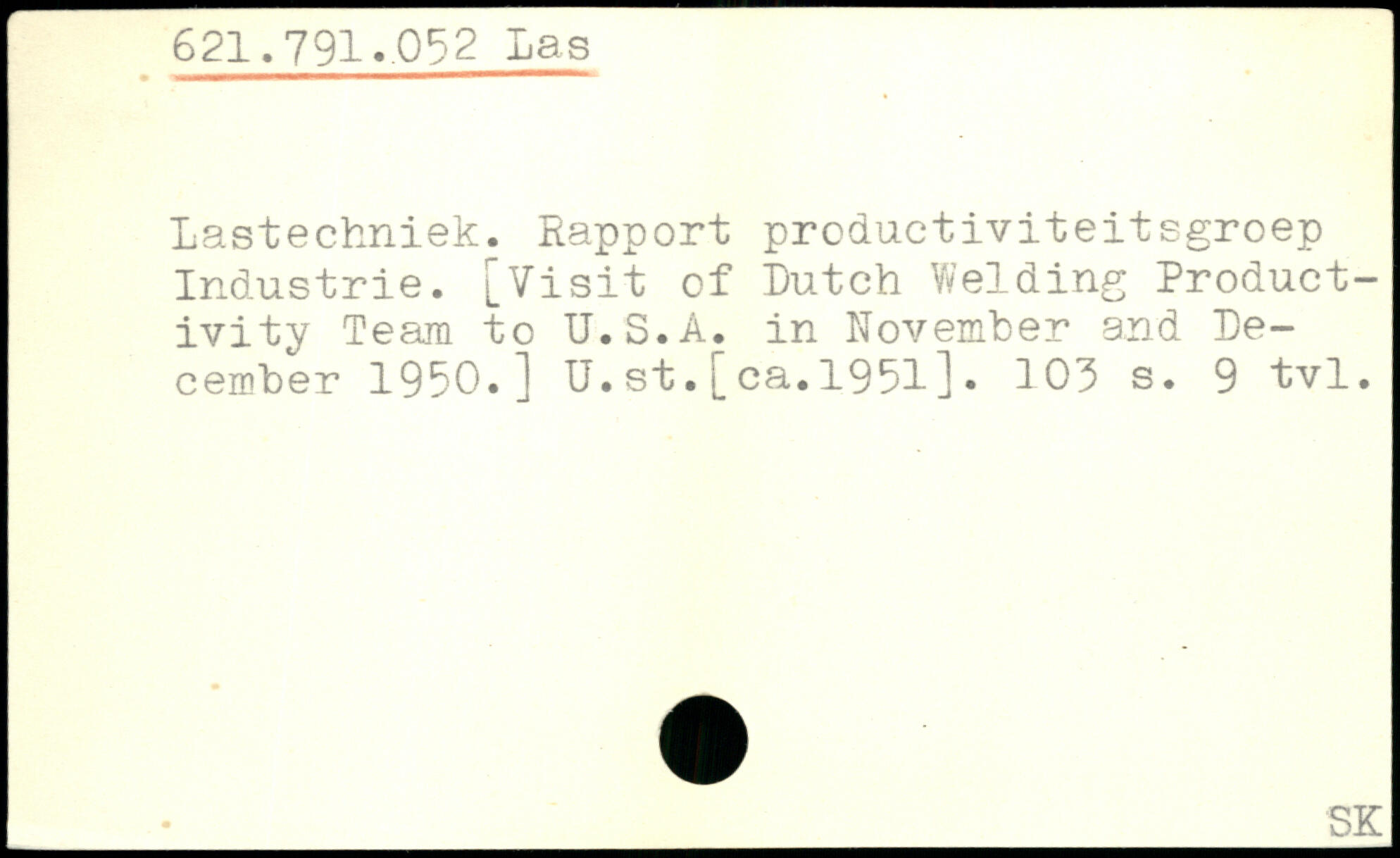 Lastechniek. Rapport productiviteitsgroep Industrie. [Visit of Dutch Welding Productivity Team to U.S.A. in November and December 1950.] U.st.[ca.1951].