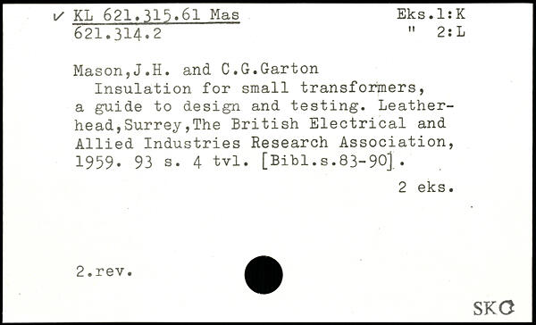 Insulation for small transformers, a guide to design and testing. Leather-head, Surrey , The British Electrical and Allied Industries Research Association, 1959.