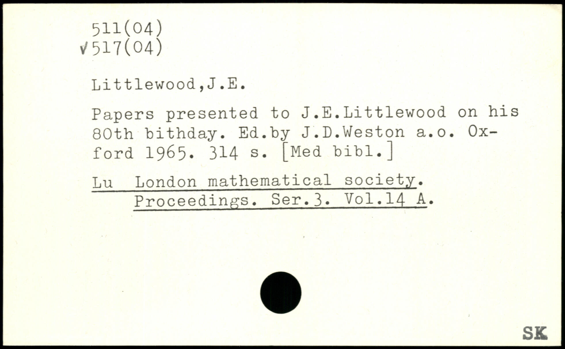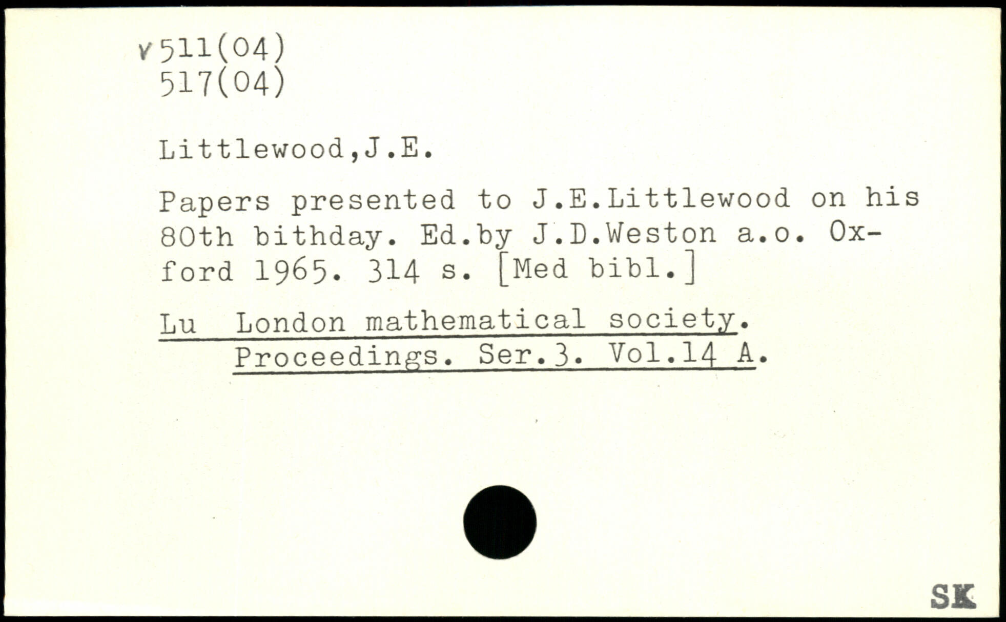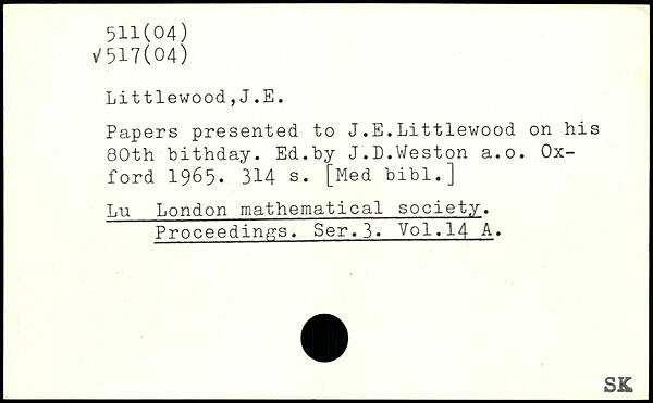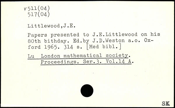 Papers presented to J.E.Littlewood on his 80th bithday. Ed.by J.D.Weston a.o.