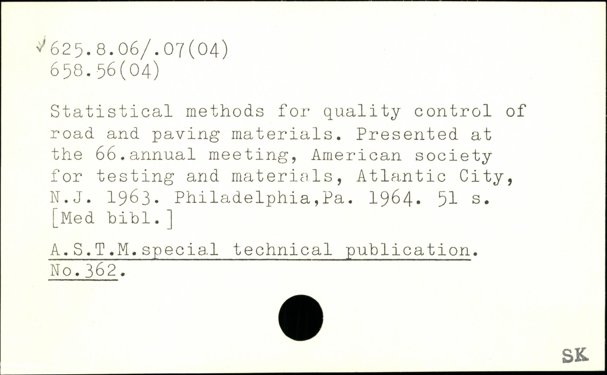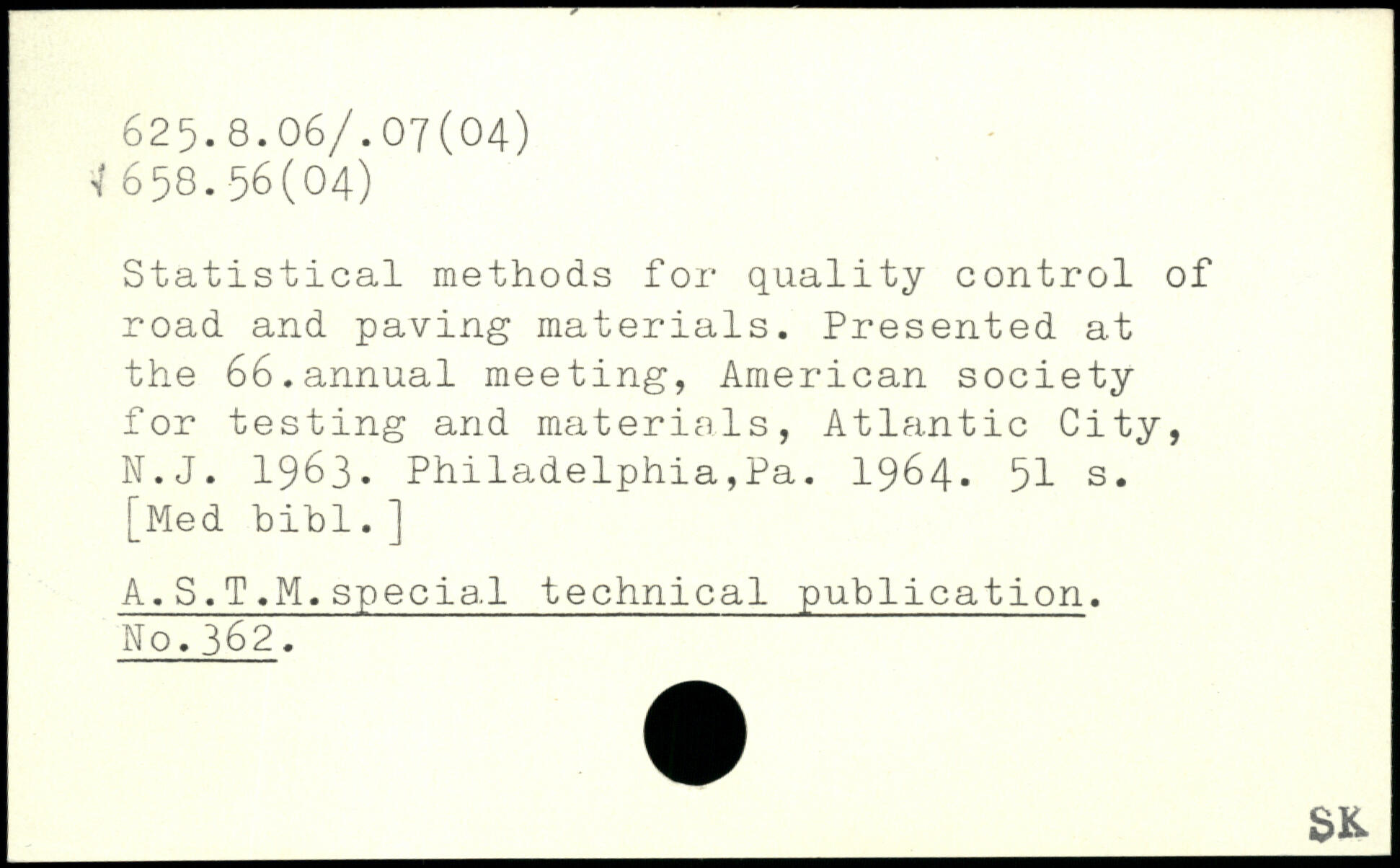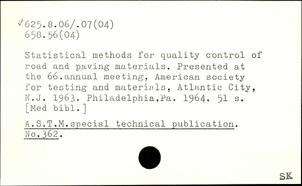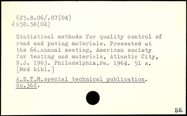 Statistical methods for quality control of road and paving materials. Presented at the 66.annual meeting, American society for testing and materials, Atlantic City, N.J. 1963. Philadelphia,Pa. 1964.