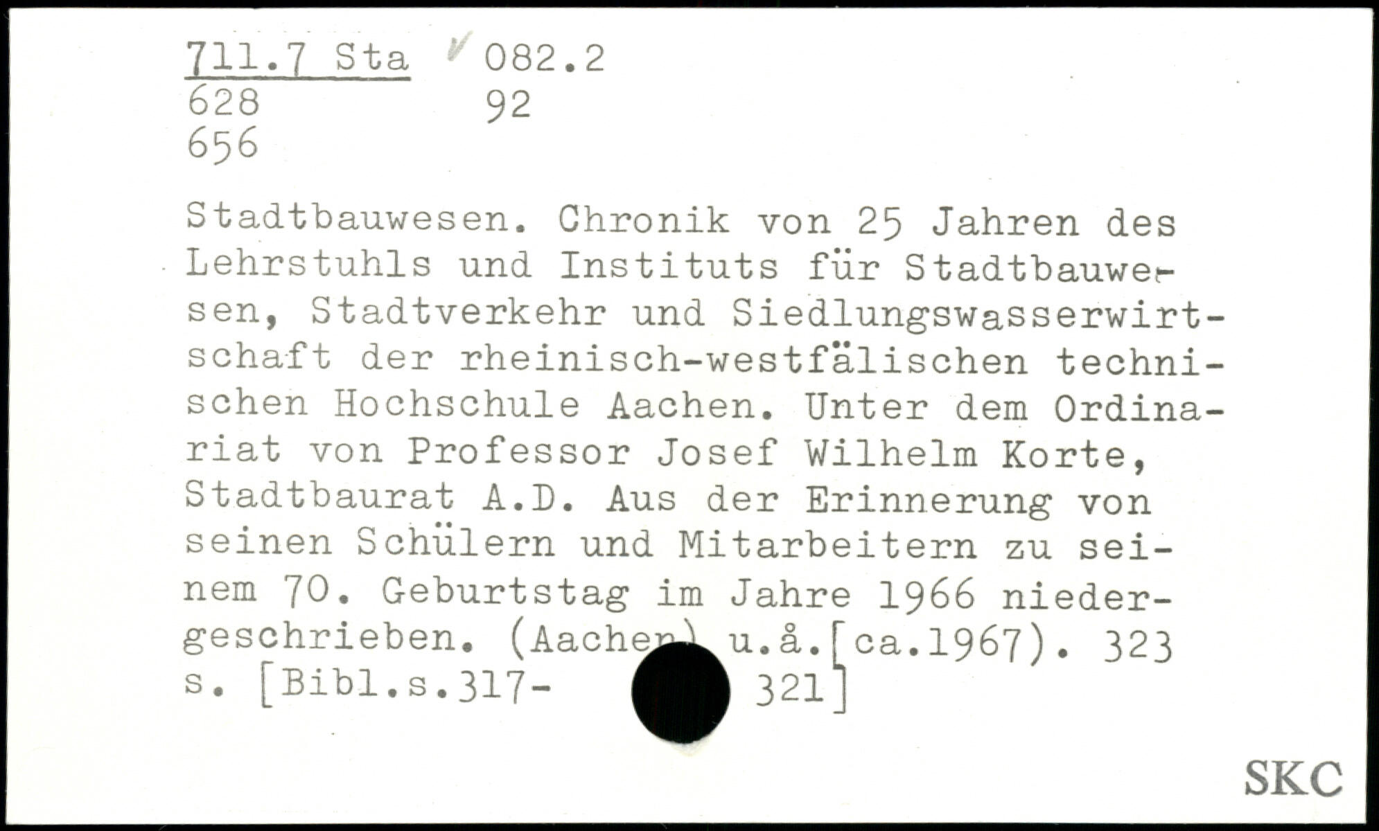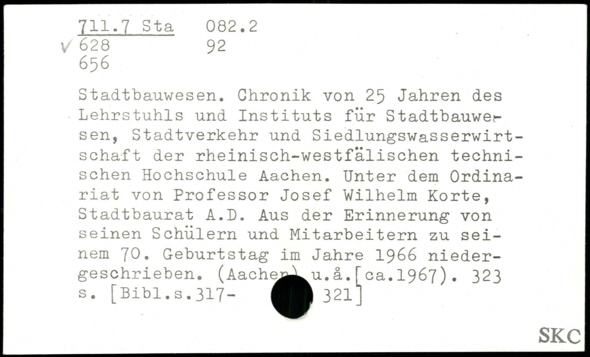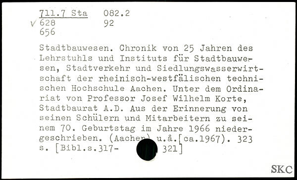 Stadtbauwesen. Chronik von 25 Jahren des Lehrstuhls und Instituts für Stadtbauwer sen, Stadtverkehr und Siedlungswasserwirtschaft der rheinisch-westfälischen technischen Hochschule Aachen. Unter dem Ordinariat von Professor Josef Wilhelm Körte, Stadtbaurat A.D. Aus der Erinnerung von seinen Schülern und Mitarbeitern zu sei- \ nem 'JO, Geburtstag im Jahre 1966 niedergeschrieben. (Aachej^L u.ä.[ca.1967).
