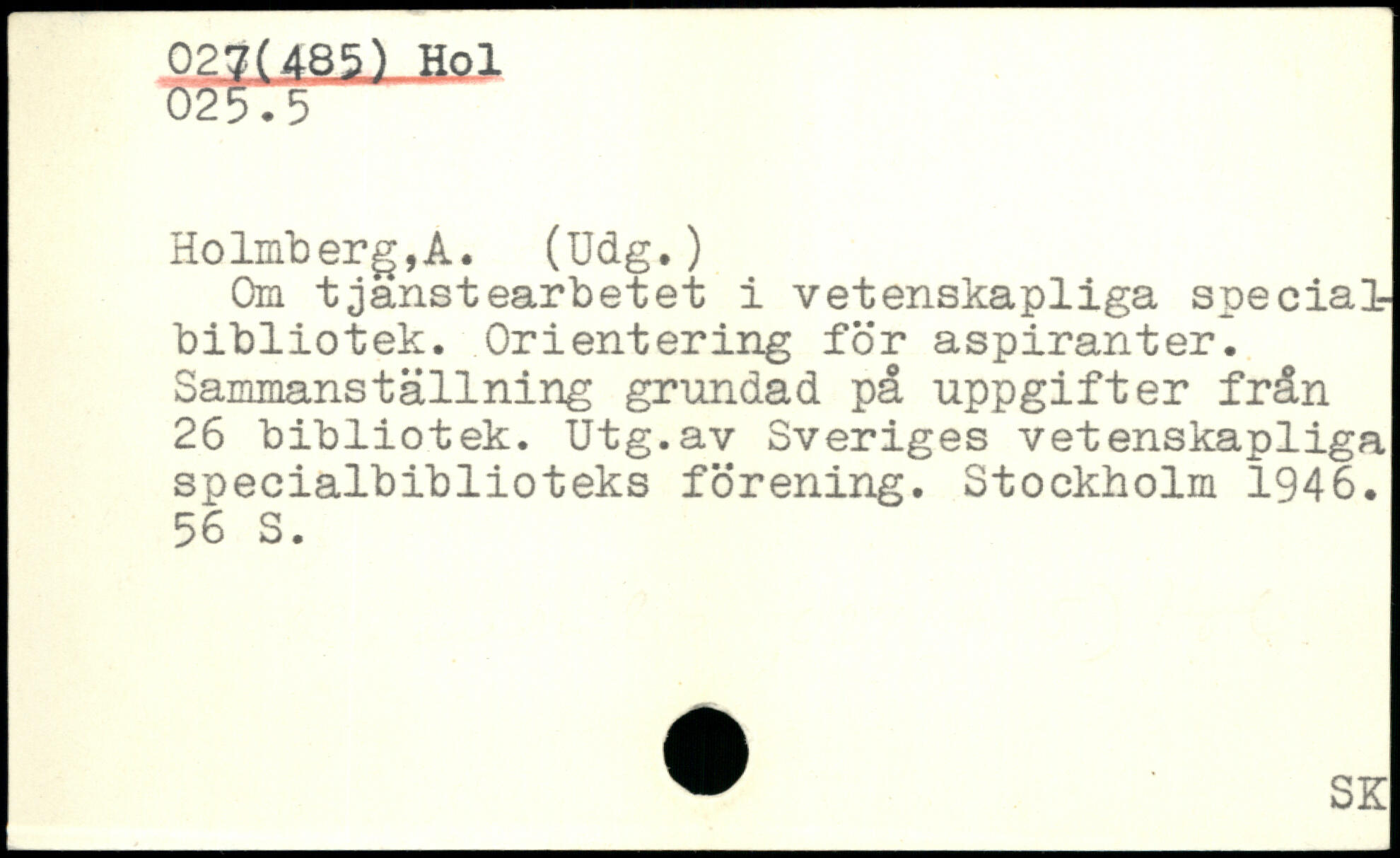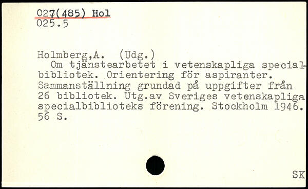 Om tjanstearbetet i vetenskapliga special bibliotek. Orientering för aspiranter. Sammanställning grundad på uppgifter från 26 bibliotek. Utg.av Sveriges vetenskapliga specialbiblioteks förening.