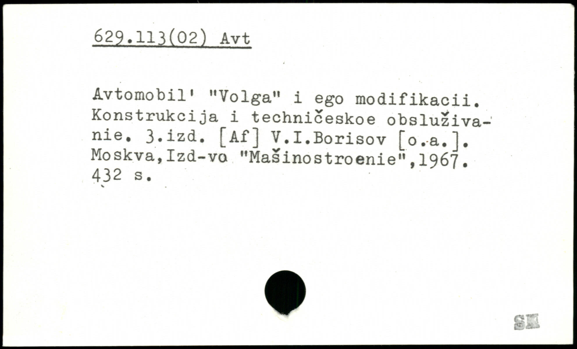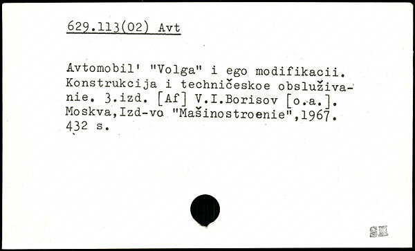 Avtomobil' "Volga" i ego modifikacii. Konstrukcija i techniceskoe obsluziva-nie. 3.izd. [Af] V.I.Borisov [o.a.]. Moskva,Izd-vo "Masinostroenie",1967.