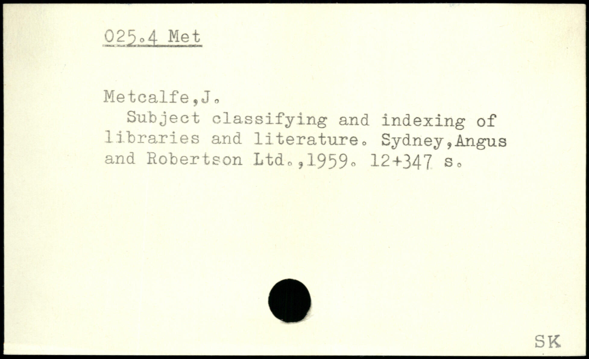 Subject classifying and indexing of libraries and literature, Sydney,Angus and Robertson Ltd,,1959.