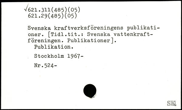Svenska kraftverksföreningens publikationer. [Tidl.tit.: Svenska vattenkraftföreningen. Publikationer]. Publikation.