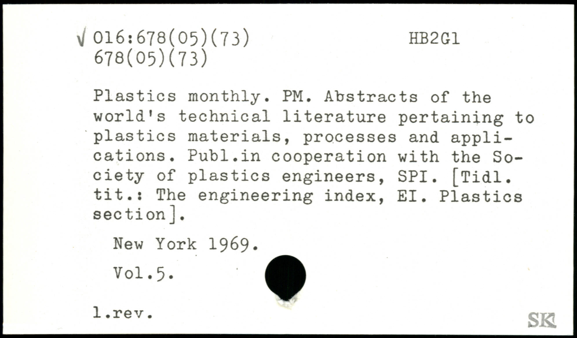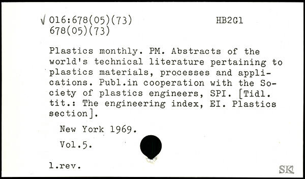 Plastics monthly. PM. Abstracts of the world’s technical literature pertaining to plastics materials, processes and applications. Publ.in cooperation with the Society of plastics engineers, SPI. [Tidl. tit.: The engineering index, El. Plastics section].