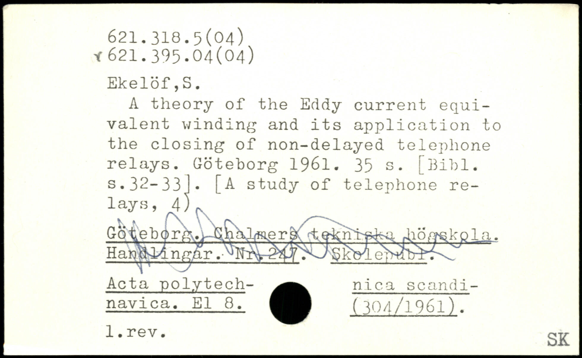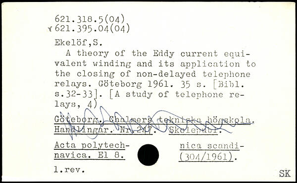 A theory of the Eddy current equivalent winding and its application to the closing of non-delayed telephone relays. Goteborg 1961.