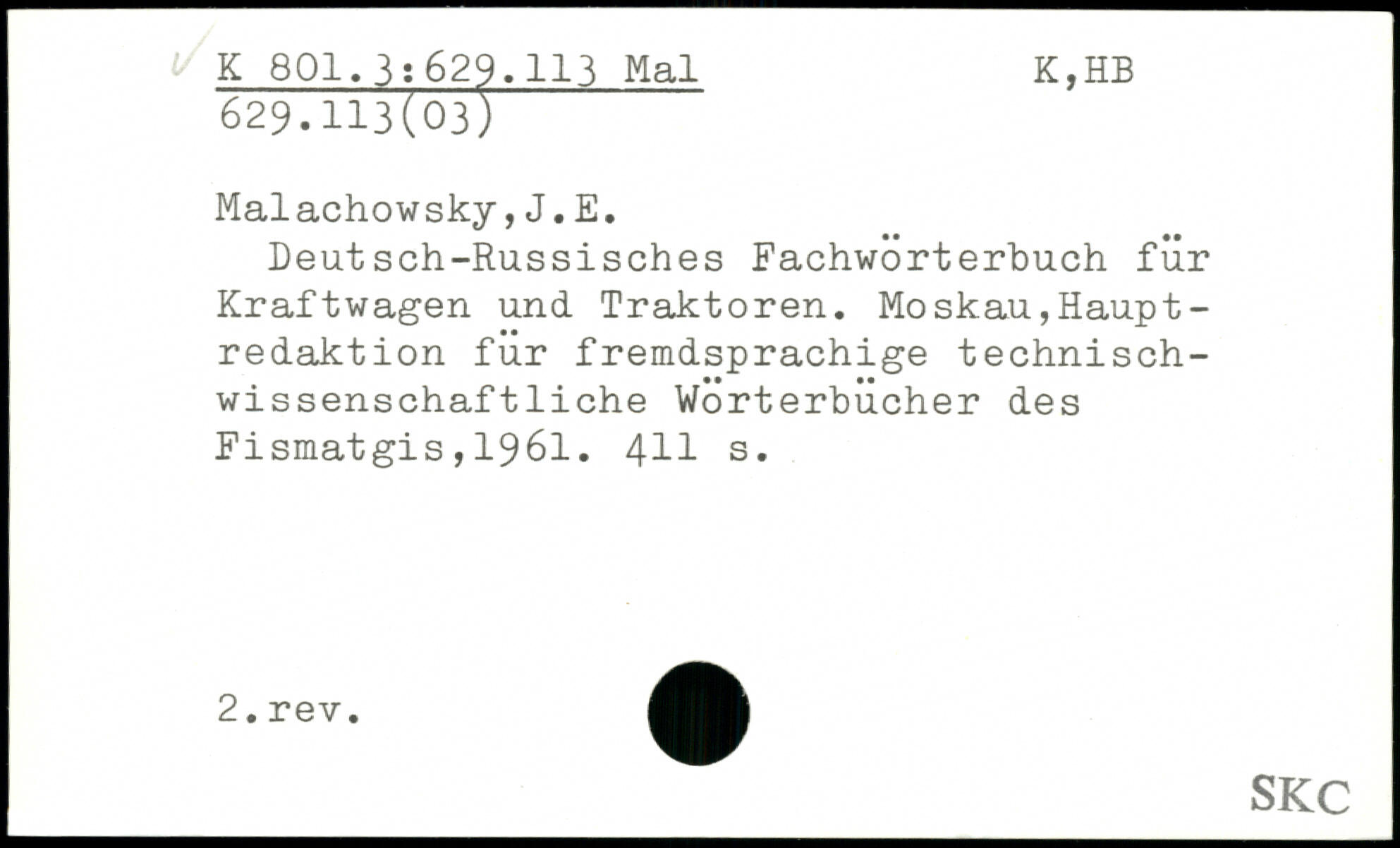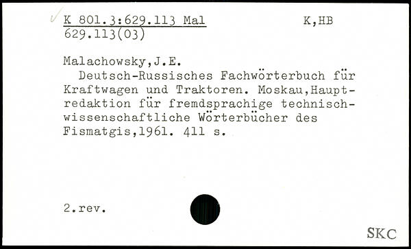 Deutsch-Russisches Fachwörterbuch für Kraftwagen und Traktoren. Moskau,Haupt-redaktion für fremdsprachige technisch-wissenschaf t liehe Wörterbücher des Fismatgis , 1961. 4H s.