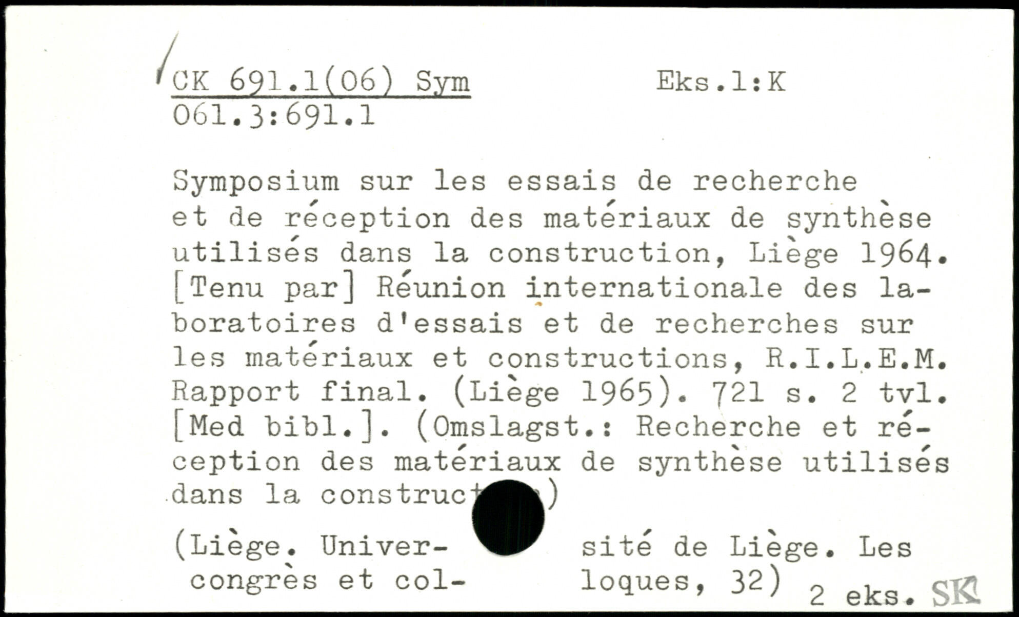 Symposium sur les essais de recherche et de réception des matériaux de synthèse utilises dans la construction, Liège 1964, [Tenu par] Réunion internationale des laboratoires d’essais et de recherches sur les matériaux et constructions, R.I.L.E.M. Rapport final. (Liège 1965).