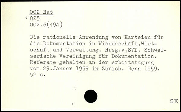 Die rationelle Anwendung von Karteien für die Dokumentation in Wissenschaft,Wirtschaft und Verwaltungc HrsgoV.SYD, Schweizerische Vereinigung für Dokumentation. Referate gehalten an der Arbeitstagung vom 29.Januar 1959 in Zürich.