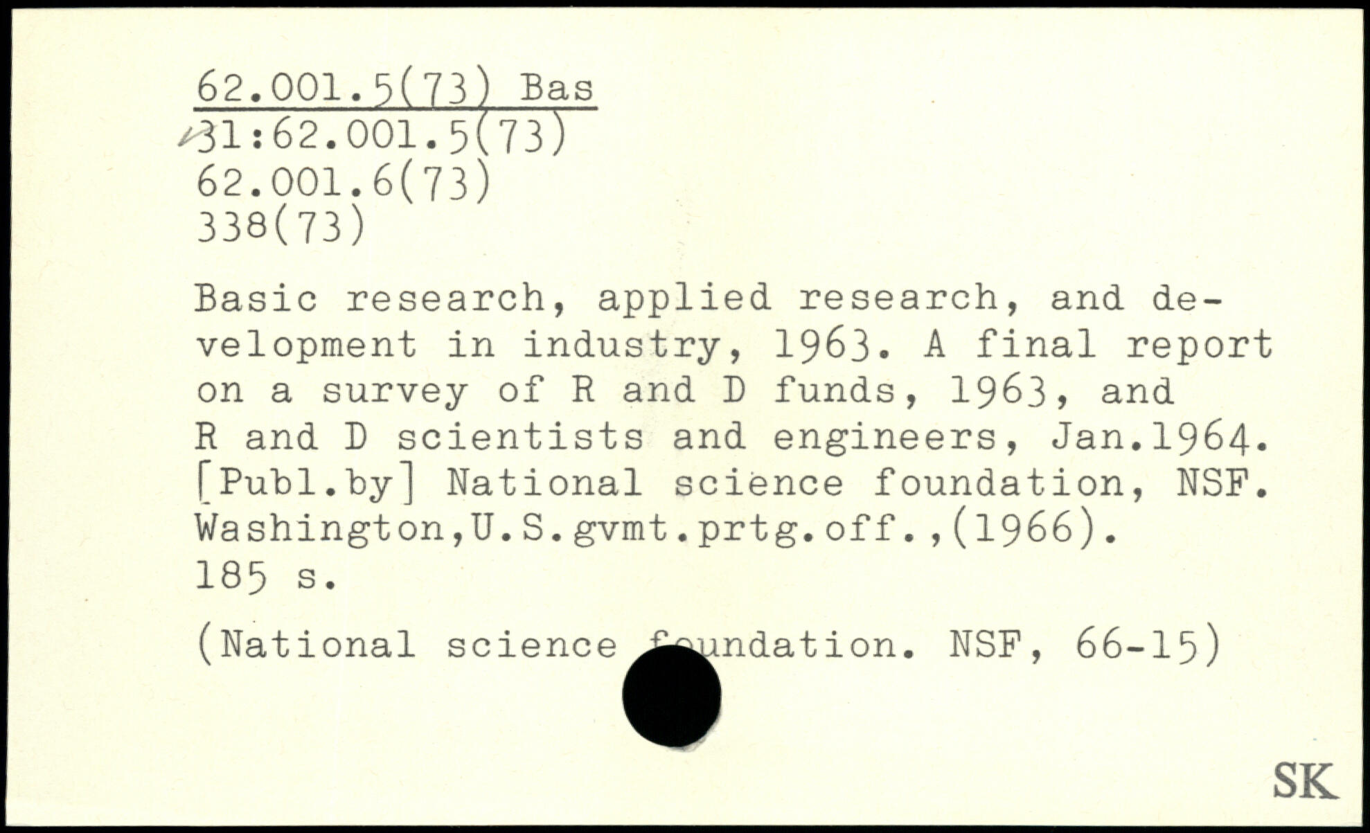 Basic research, applied research, and development in industry, 1963. A final report on a survey of R and D funds, 1963, and R and D scientists and engineers, Jan.1964.