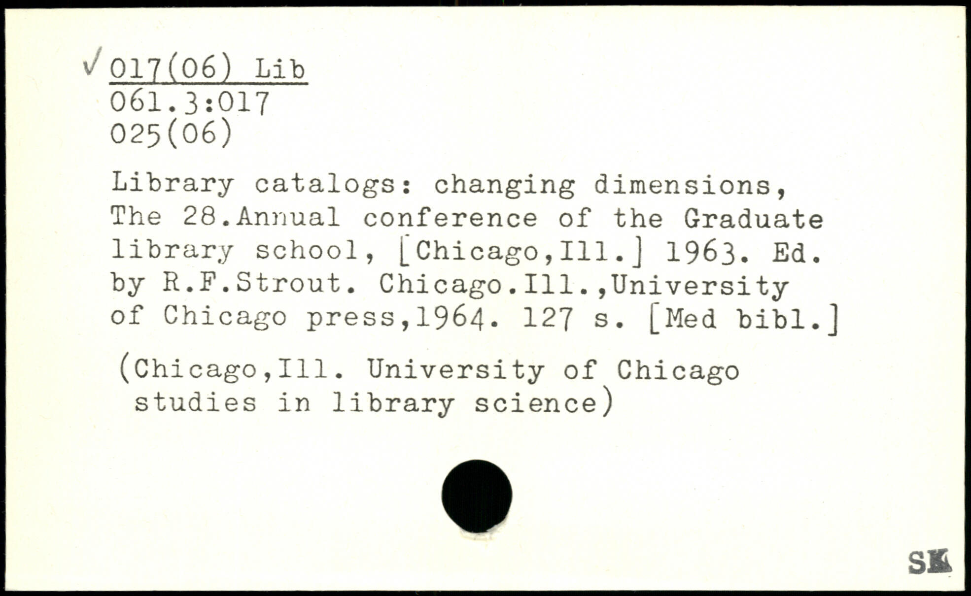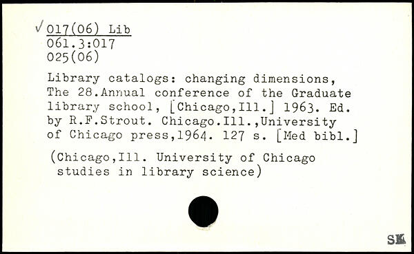 Library catalogs: changing dimensions, The 28.Annual conference of the Graduate library school, [Chicago,111.J 1963. Ed. by R.F.Strout. Chicago.