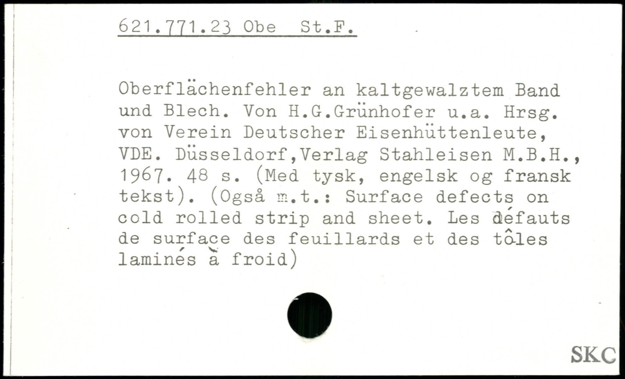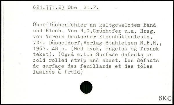 Oberflachenfehler an kaltgewalztem Band und Blech. Von H.G.Grunhofer u.a. Hrsg, von Verein Deutscher Eisenhüttenleute, VDE. Düsseldorf,Verlag Stahleisen M.B.H., 1967.