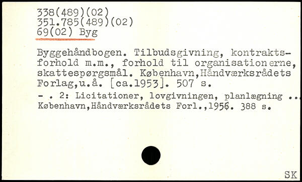 Byggehåndbogen. Tilbudsgivning, kontrakts-forhold m.nu, forhold til organisationerne, skattespørgsmål. København,Håndværksrådets Forlag,u.å. [ca.1953].