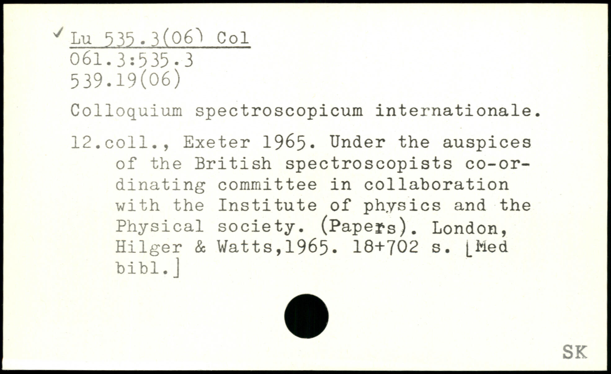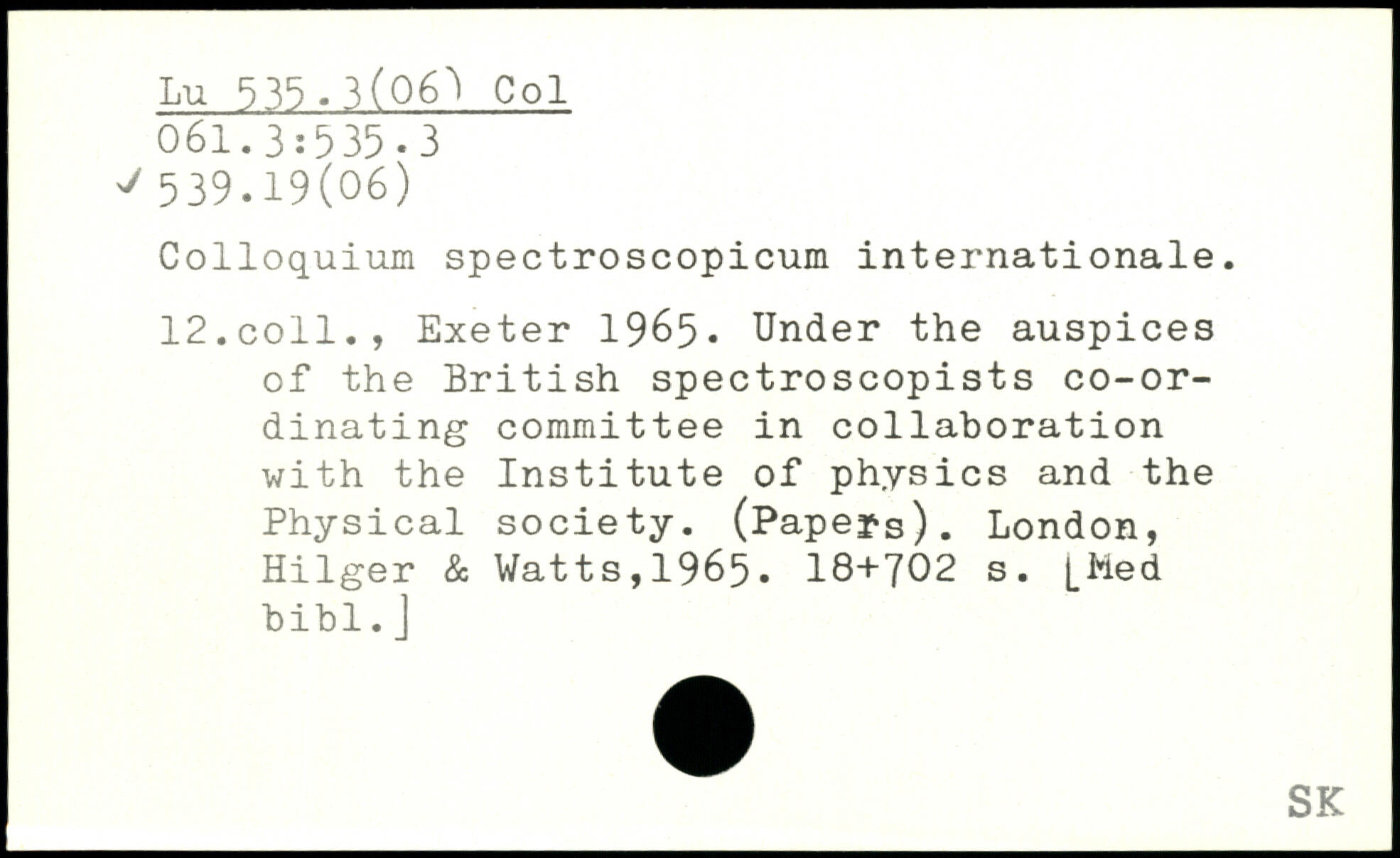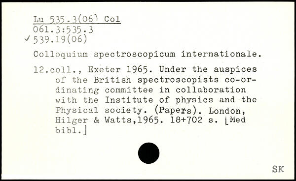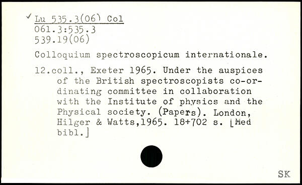 Colloquium spectroscopicum internationale. 12.coll., Exeter 1965. Under the auspices of the British spectroscopists co-ordinating committee in collaboration with the Institute of physics and the Physical society. (Papers).