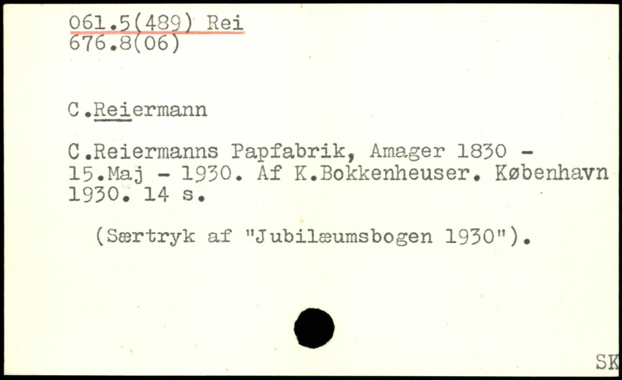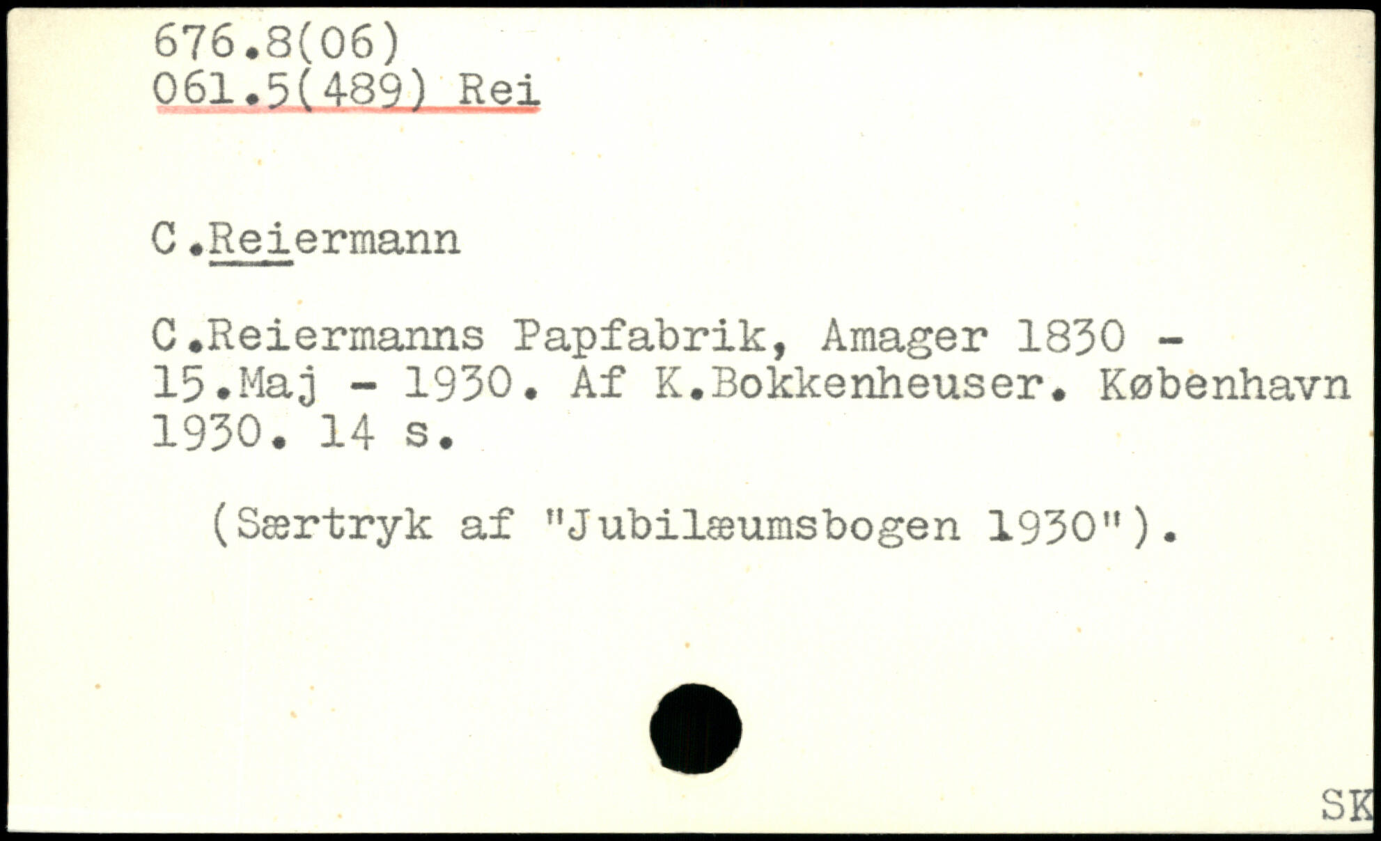 C.Reiermanns Papfabrik, Amager 1830 -15.Maj - 1930. Af K.Bokkenheuser.