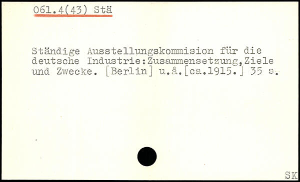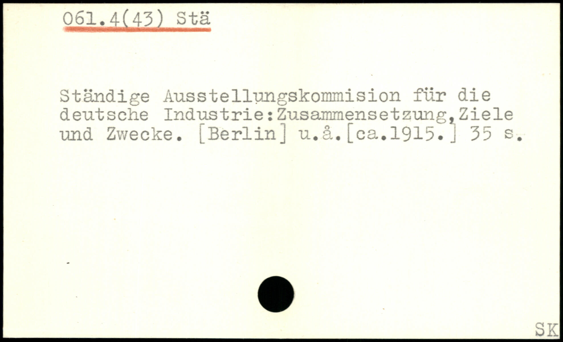 Ständige Ausstellungskommision flir die deutsche Industrie :Zusammensetzung^Ziele und Zwecke. [Berlin] u.å.[ca.1915.J