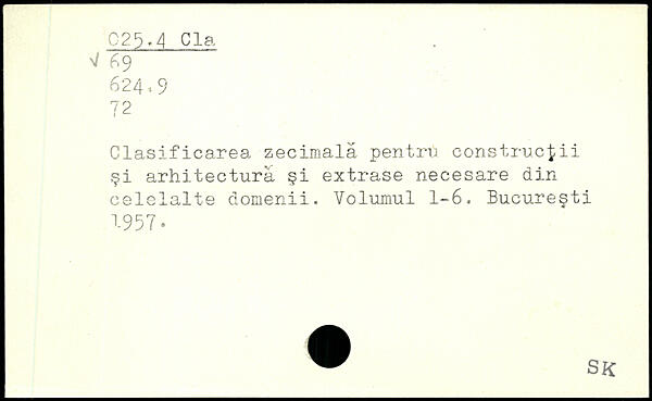 Clasificarea zecimalä pentm construe^ii çi arhitecturà §i extrase necesare din celelalte domenii. Volumul 1-6. Bucureçti 1957.
