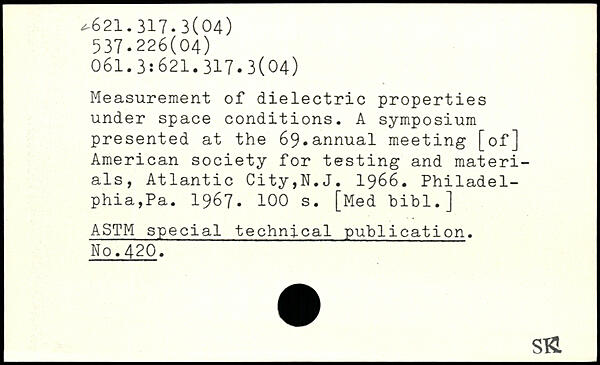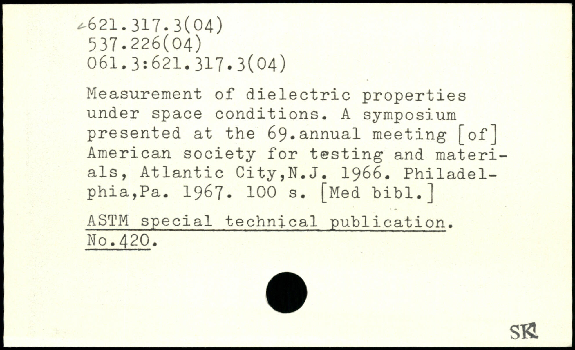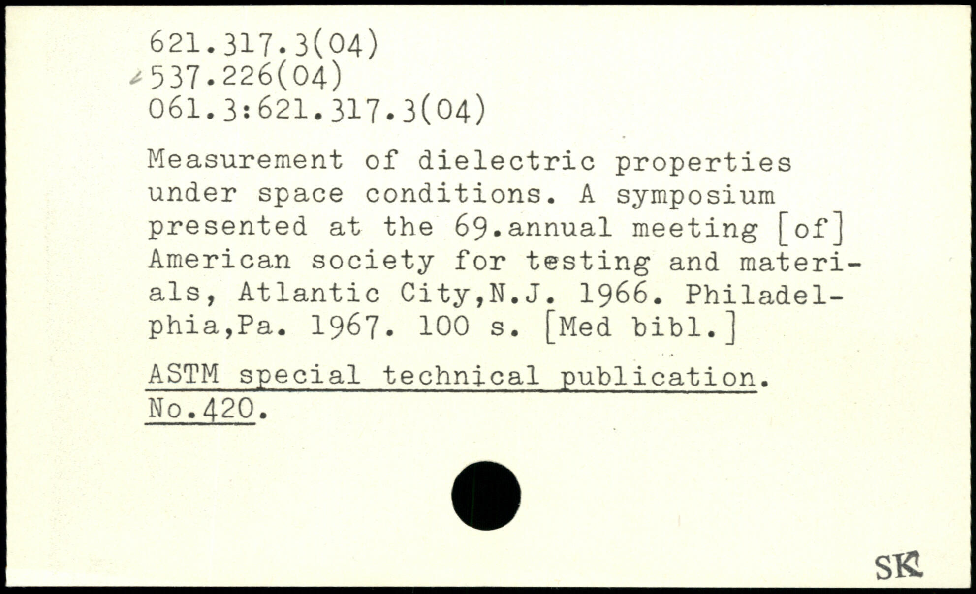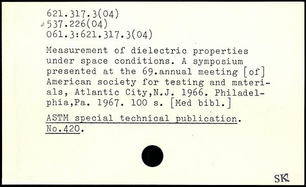 Measurement of dielectric properties under space conditions. A symposium presented at the 69.annual meeting [of] American society for testing and materials, Atlantic City,N.J. 1966. Philadelphia,Pa. 1967