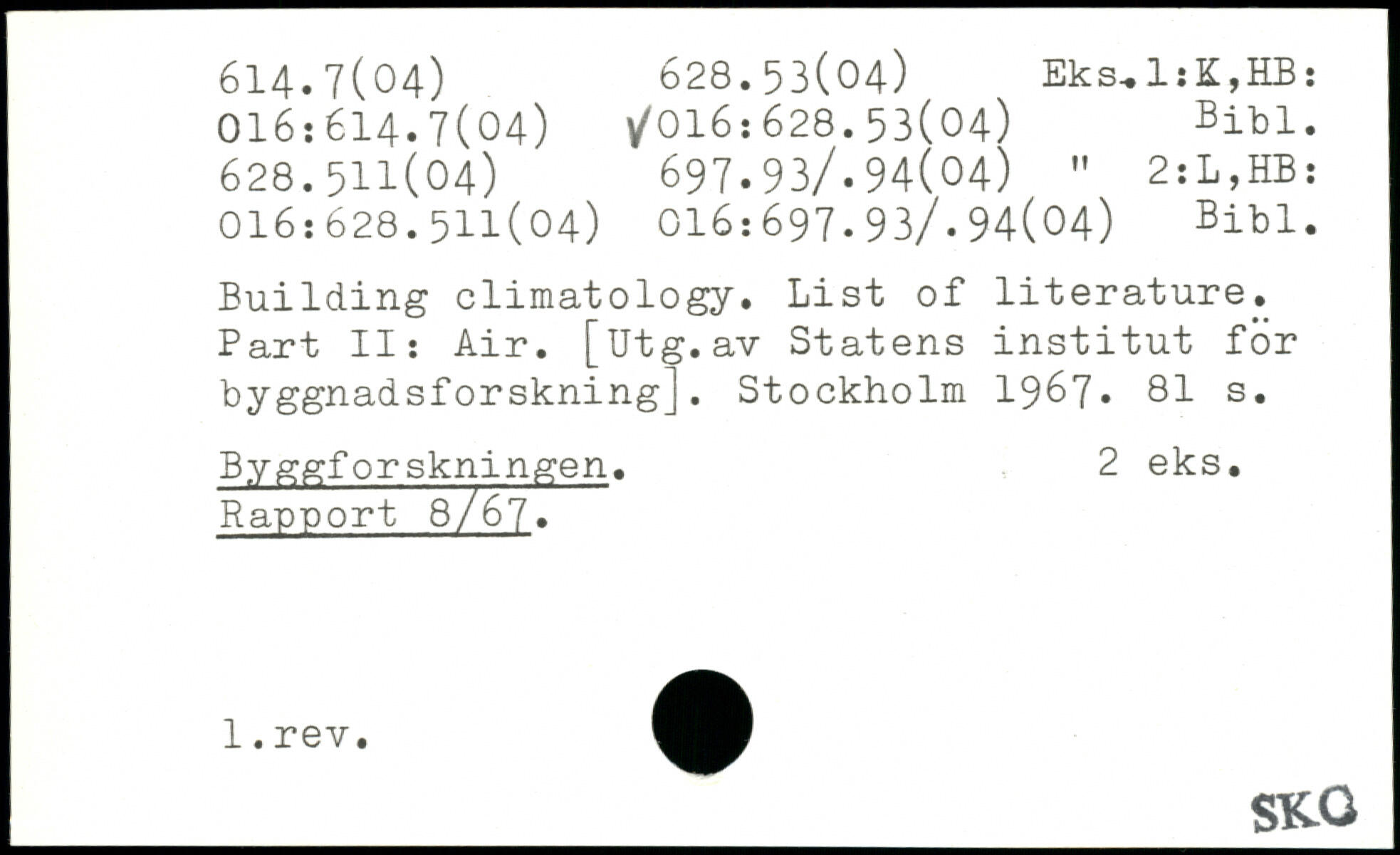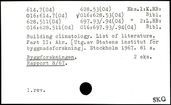 Building climatology. List of literature. Part II: Air. [Utg.av Statens institut for byggnadsforskning].