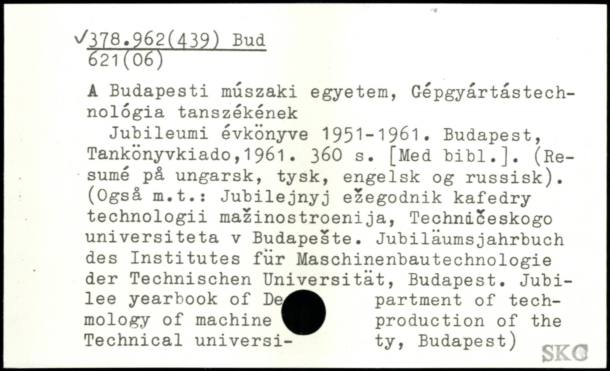 A Budapesti muszaki egyetem, Gepgyärtastech-nologia tanszekenek Jubileumi evkönyve 1951-1961.