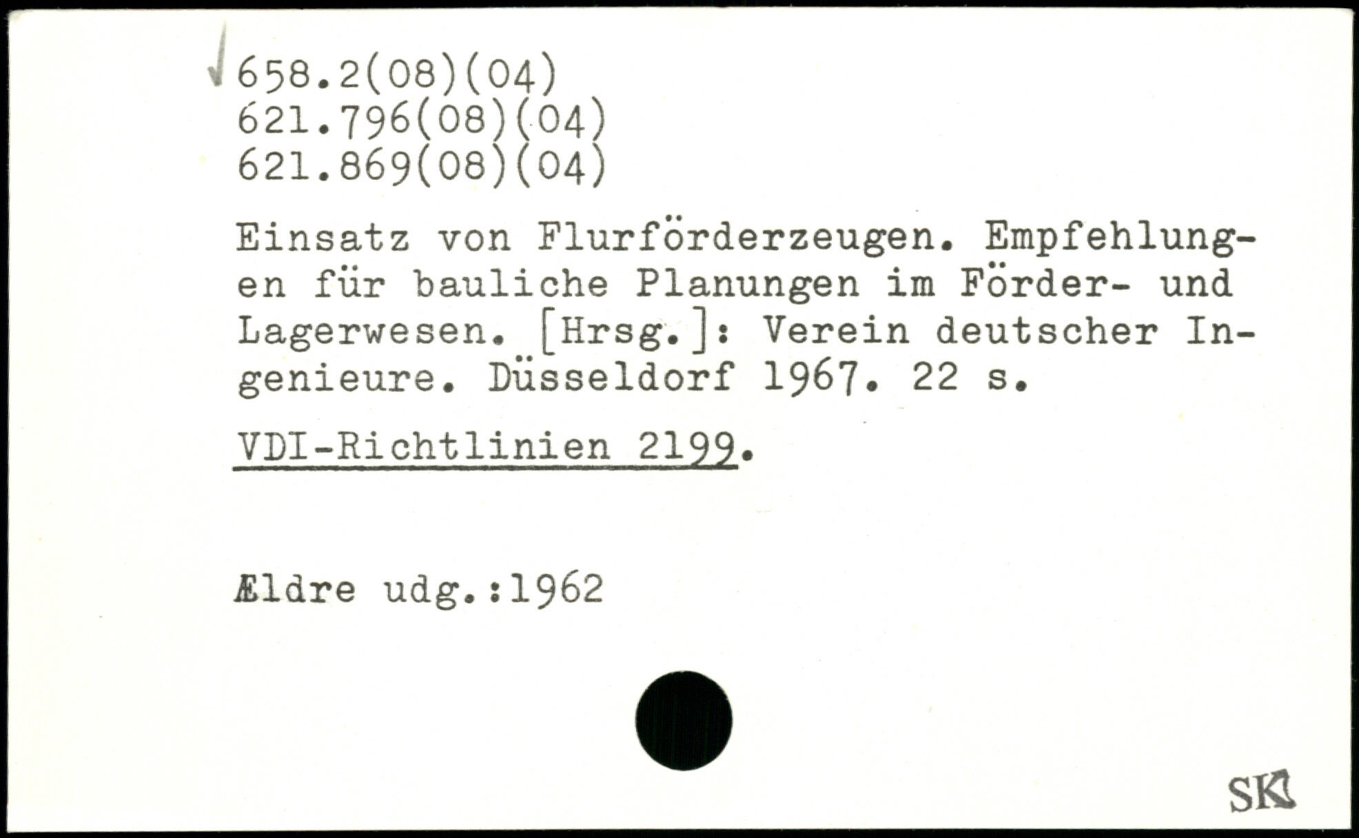 Einsatz von Flurförderzeugen. Empfehlungen für bauliche Planungen im Förder- und Lagerwesen. [Hrsg.]: Verein deutscher Ingenieure. Düsseldorf 1967