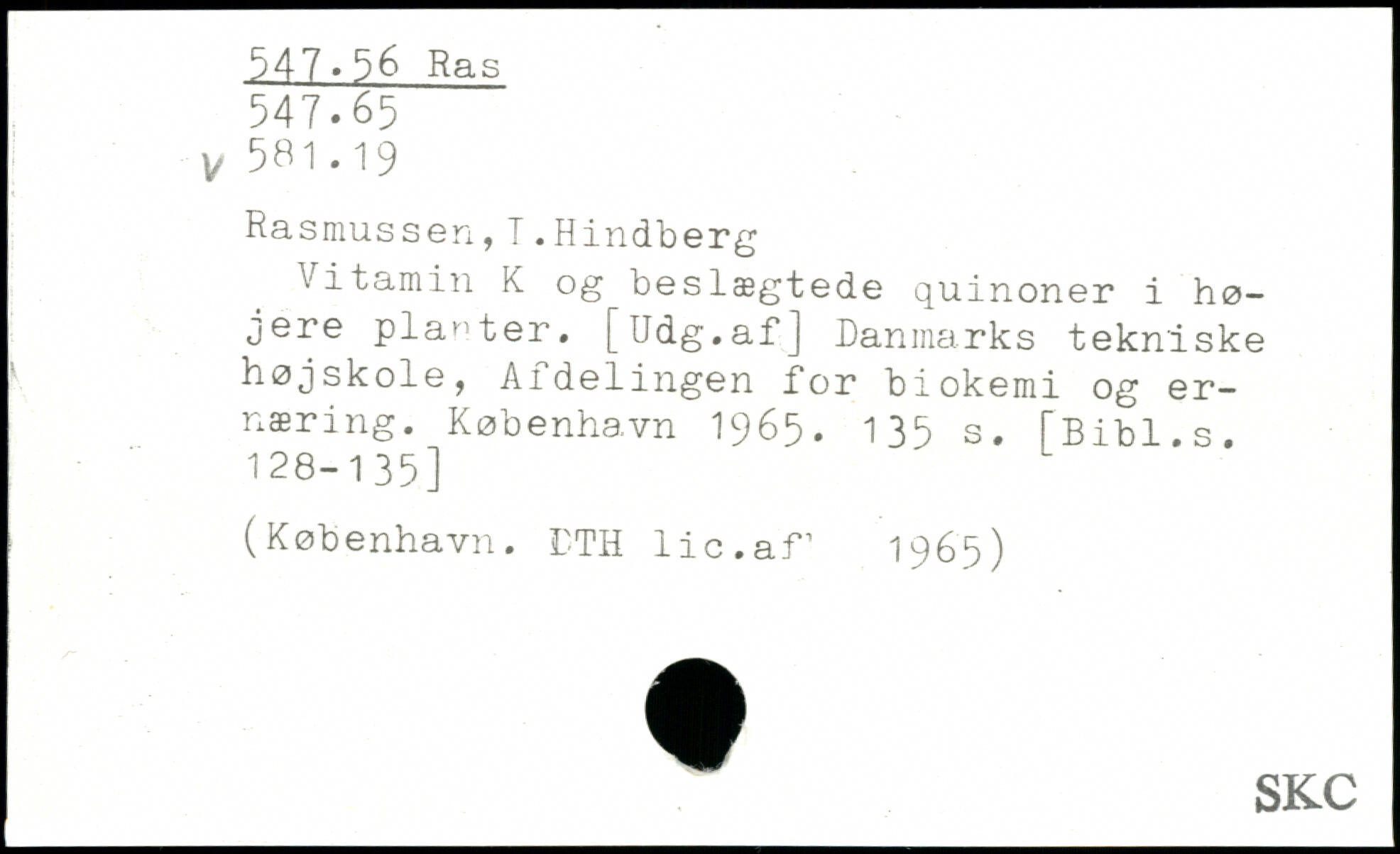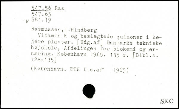Rasmussen,T.Hindberg Vitamin K og beslægtede quinoner i højere planter. [Udg.af] Danmarks tekniske højskole, Aidelingen for biokemi og ernæring.