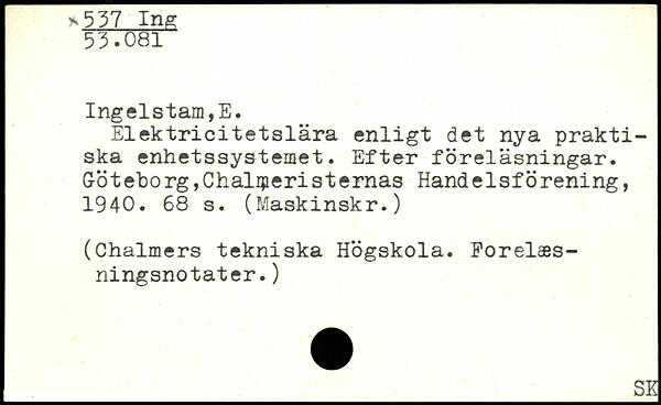 Elektricitetslära enligt det nya praktiska enhetssystemet. Efter föreläsningar. 0öteborg,Chalq3eristernas Handelsförening, 1940.