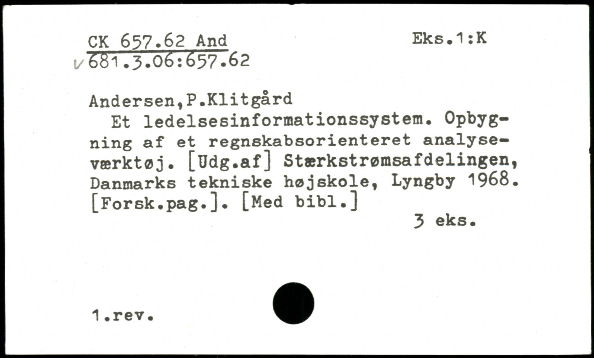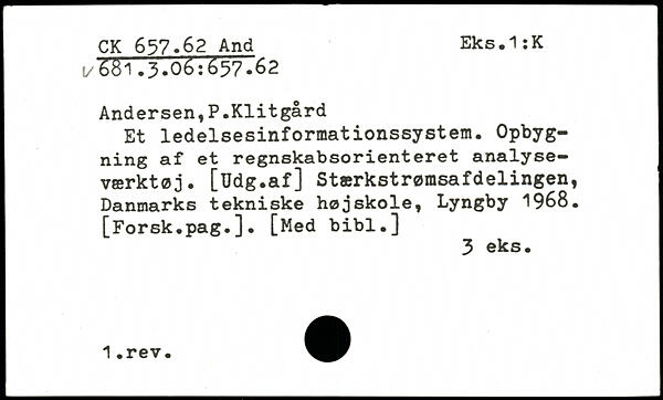 Andersen,P.Klitgård Et ledelsesinformationssystem. Opbygning af et regnskabsorienteret analyse-værktøj. [TJdg.af ] Stærkstrømsafdelingen, Danmarks tekniske højskole, Lyngby 1968. [Forsk.pag.]. [Med bibl.]