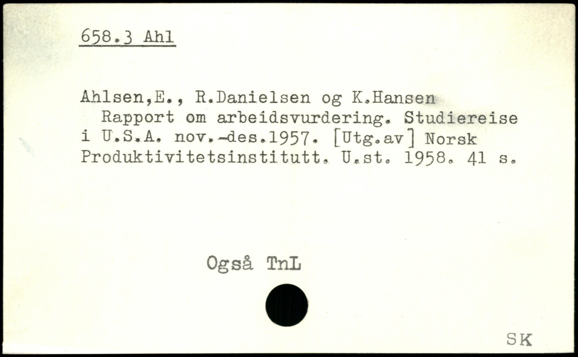 Ahlsen,E#, R.Danielsen og K.Hansen Rapport om arteidsvurdering. Studiereise i U.S.A. nov.-des.1957
