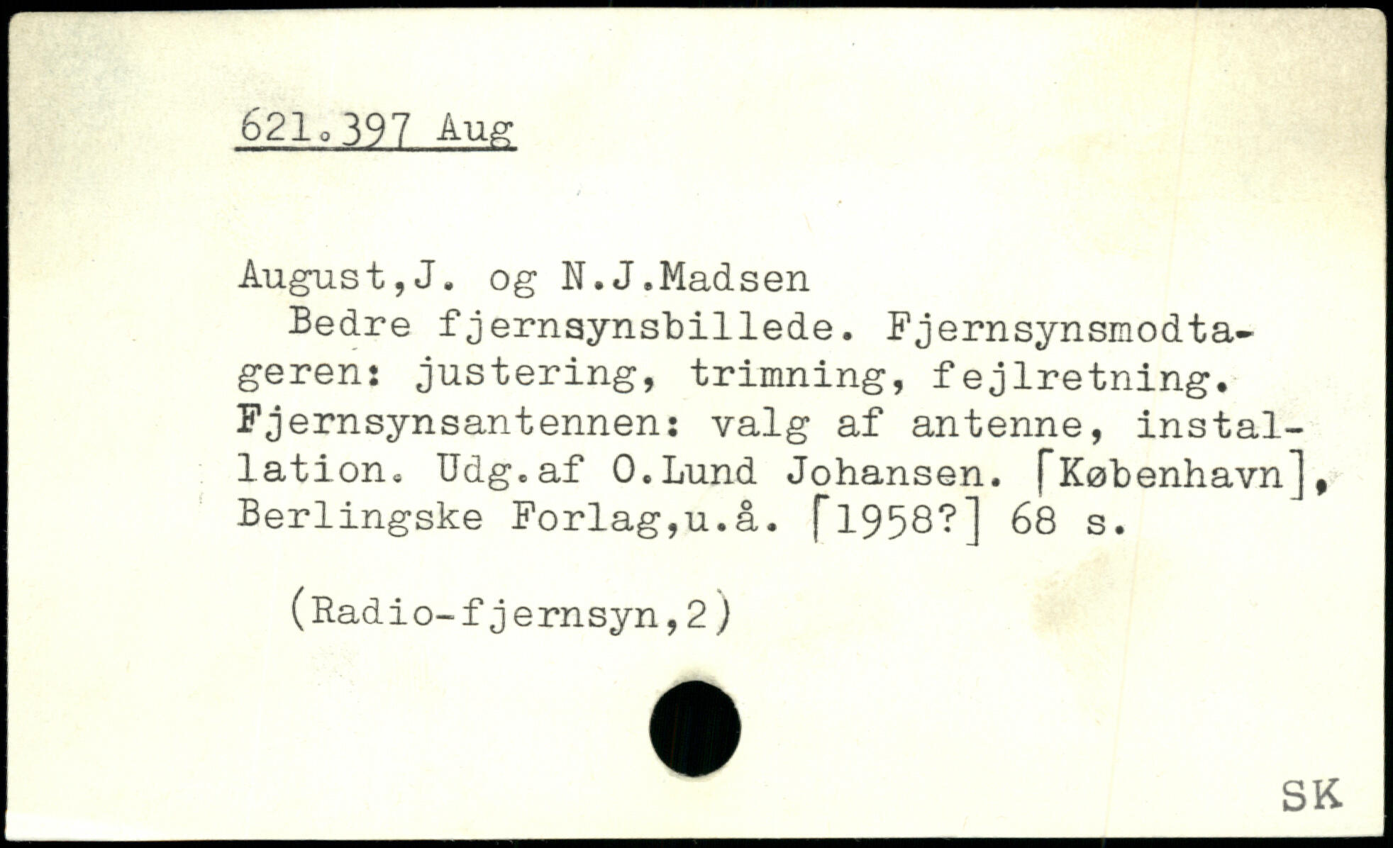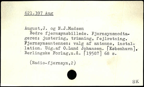 Bedre fjernsynsbillede. Fjernsynsmodtageren: justering, trimning, fejlretning. Fjernsynsantennen; valg af antenne, installation, Udg.af O.Lund Johansen. ("København], Berlingske Forlag,u.å. f1958?]