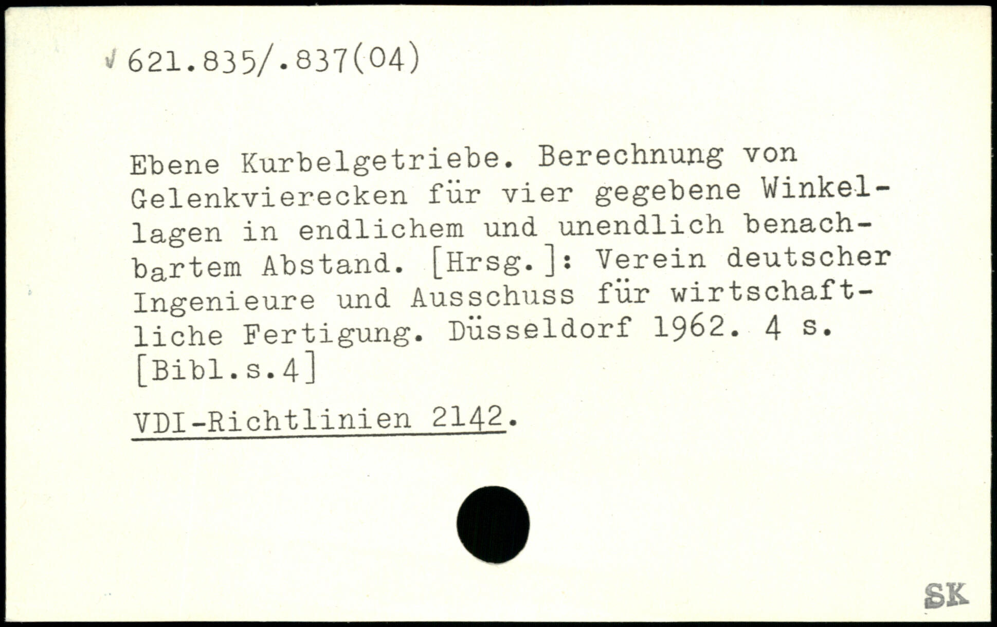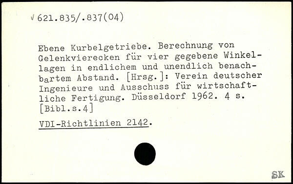 Ebene Kurbelgetriebe. Berechnung von Gelenkvierecken für vier gegebene Winkellagen in endlichem und unendlich benachbartem Abstand. [Hrsg.]: Verein deutscher Ingenieure und Ausschuss für wirtschaftliche Fertigung. Düsseldorf 1962.