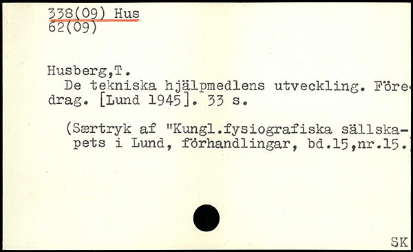 æmr— Husberg,!. De tekniska hjälpmedlens utveckling. Föredrag. [Lund 1945].