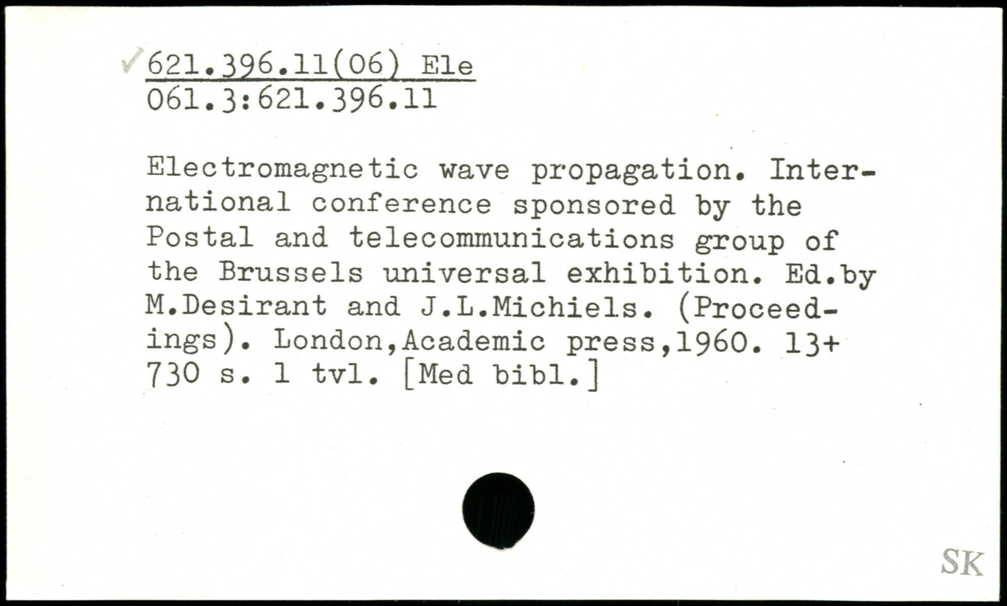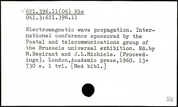 Electromagnetic wave propagation. International conference sponsored by the Postal and telecommunications group of the Brussels universal exhibition. Ed.by M.Desirant and J.L.Michiels. (Proceedings).