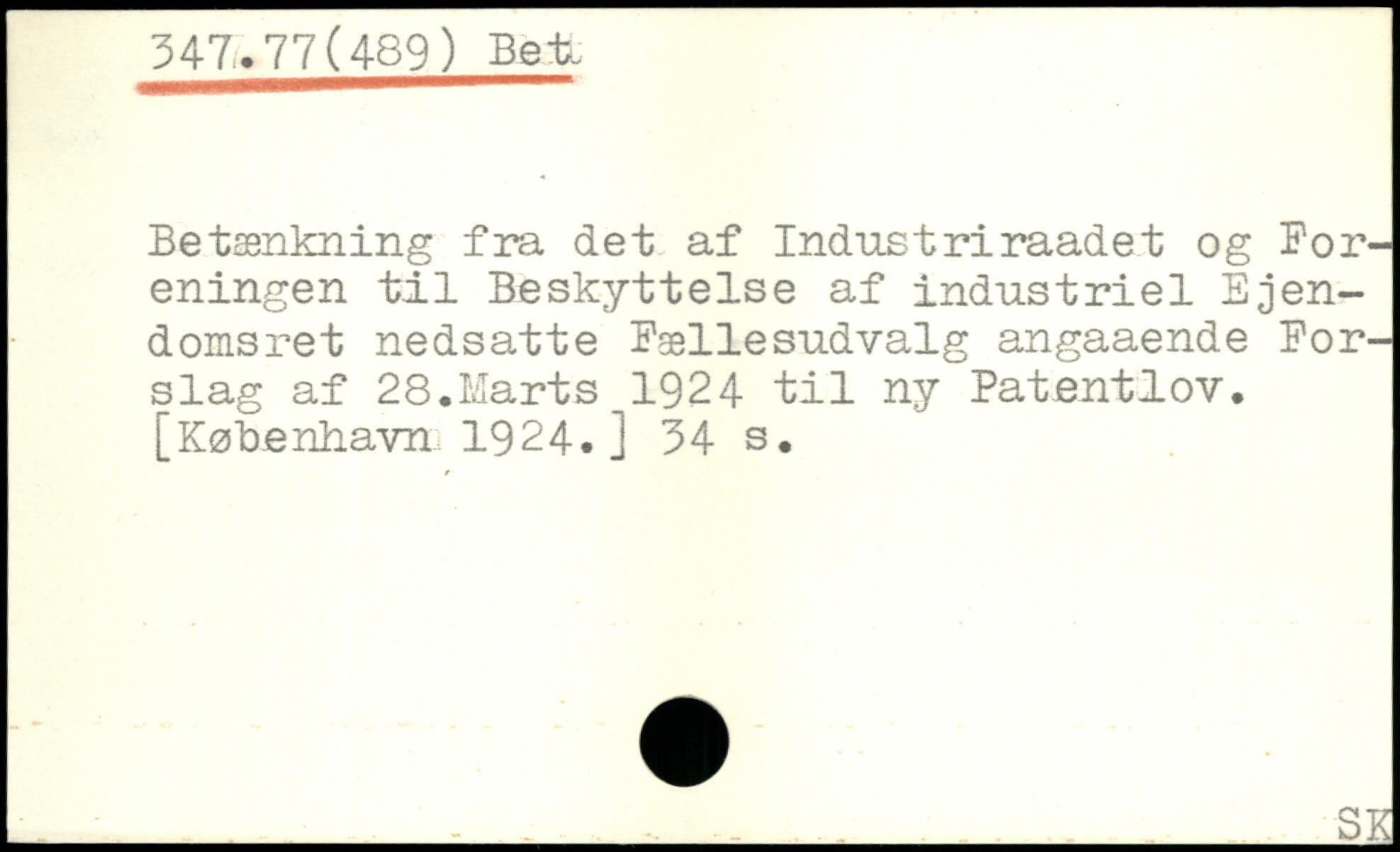 Betænkning fra det af Industriraadet og Foreningen til Beskyttelse af industriel Ejendomsret nedsatte Fællesudvalg angaaende Forslag af 28.Marts 1924 til ny Patentlov.