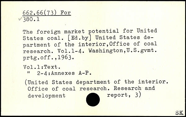 The foreign market potential for United States coal. [Ed.by] United States department of the interior,Office of coal research.