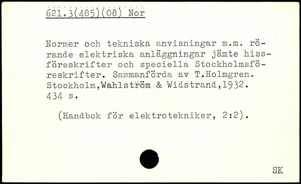 Normer och tekniska anvisningar m.m. rörande elektriska anläggningar jämte hissföreskrifter och speciella Stockholmsfö-reskrifter. Sammanförda av T.Holmgren.